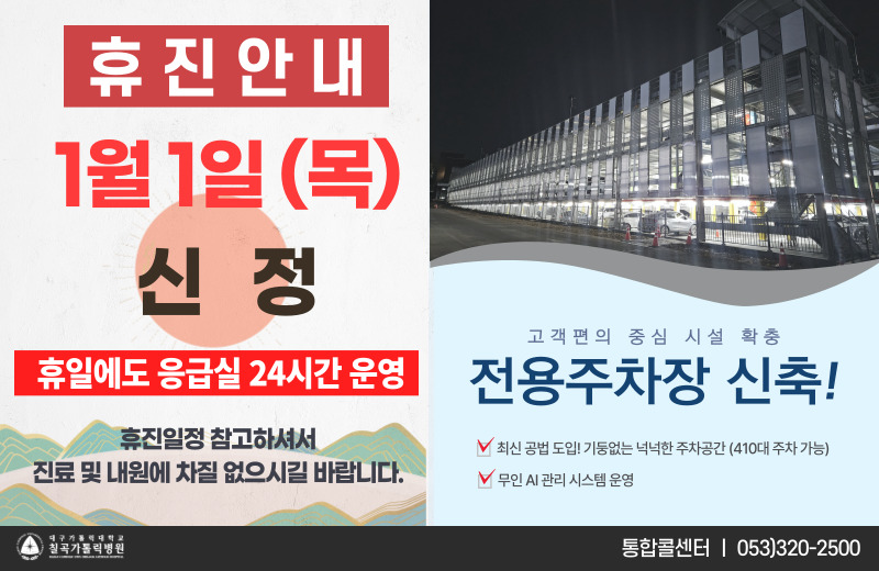 12월25일목요일은성탄절,26년1월1일목요일은신정으로인한외래진료휴진입니다.특히약을정기적으로복용하셔야하는분들은휴진일정참고하셔서미리넉넉하게처방받으시고휴진기간동안불편함을겪지않도록확인부탁드립니다.연휴를포함한모든공휴일에도칠곡가톨릭병원응급실은365일24시간내내전문의가상주하여진료하고있으므로갑작스러운응급상황발생시당황하지마시고칠곡가톨릭병원응급실을방문하여주시기바랍니다.