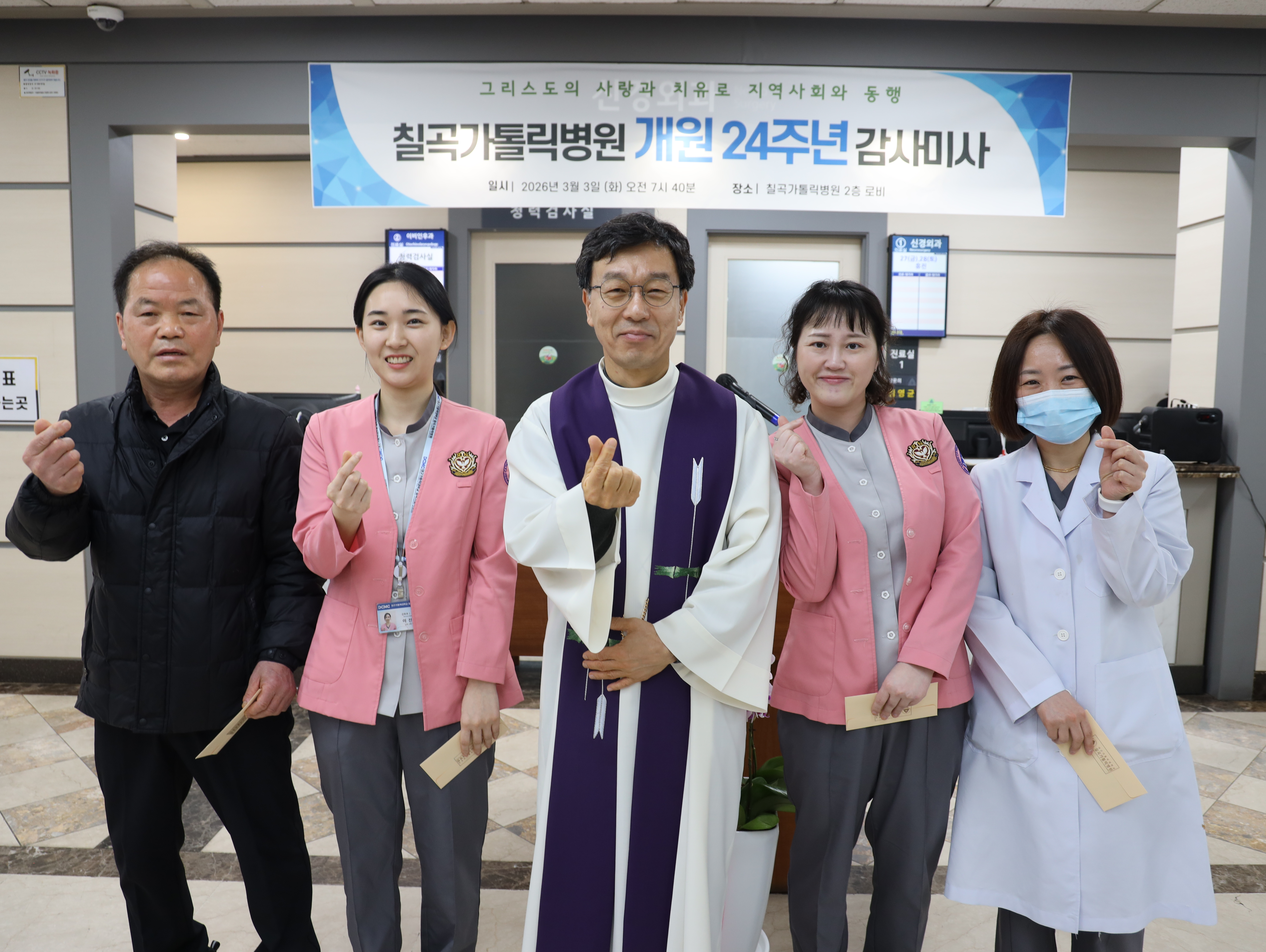 Change with you, 환자중심의 칠곡가톨릭병원입니다. 3월 3일 화요일 오전, 칠곡가톨릭병원 개원 24주년을 기념하기 위해 많은 직원들이 모인 가운데 개원 감사 미사를 봉헌하였습니다! 개원 24주년을 함께 축하하고, 격려하기 위해 이른 아침부터 직원분들이 참례를 하여 따뜻한 시간이 되었습니다. 2002년 개원 이후 지역친화, 환자중심이라는 이념 아래 지난 24년간 지역 주민들을 위해 최상의 의료 서비스를 위해 최선을 다할 수 있도록 격려의 말씀을 하셨습니다. 또한 칠곡가톨릭병원을 위해 10년, 20년이라는 오랜 시간을 함께 해주신 장기 근속 근무자에 대한 시상도 함께 있었습니다. 이른 시간에도 칠곡가톨릭병원 개원 24주년을 함께 축하해주신 직원 분들과 지난 24년간 칠곡가톨릭병원과 함께 해주신 모든 분들께 감사의 인사를 드립니다.