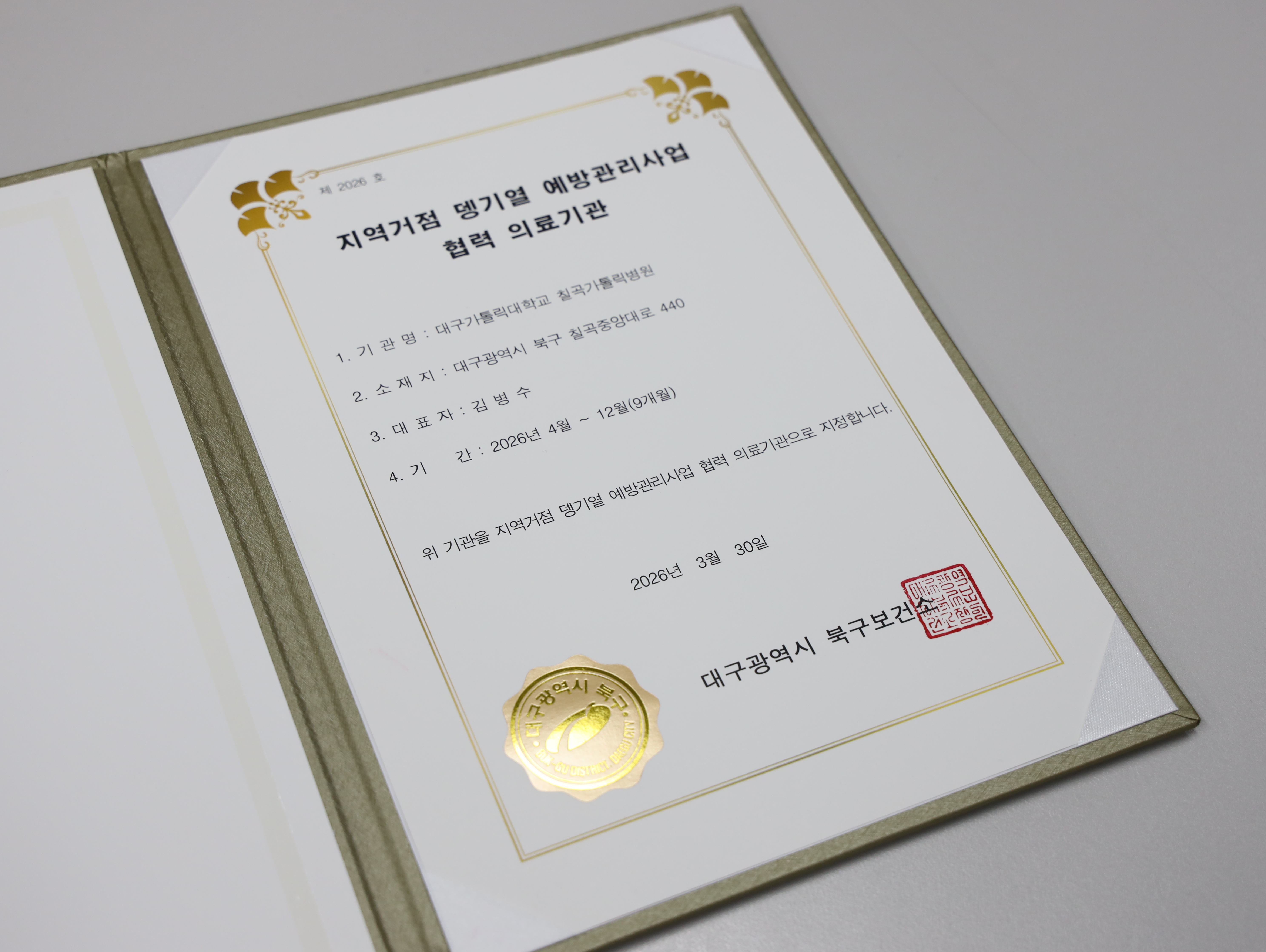 | [병원소식] 칠곡가톨릭병원-북구보건소 지역거점 뎅기열 예방관리사업 협력의료기관 지정 | ||