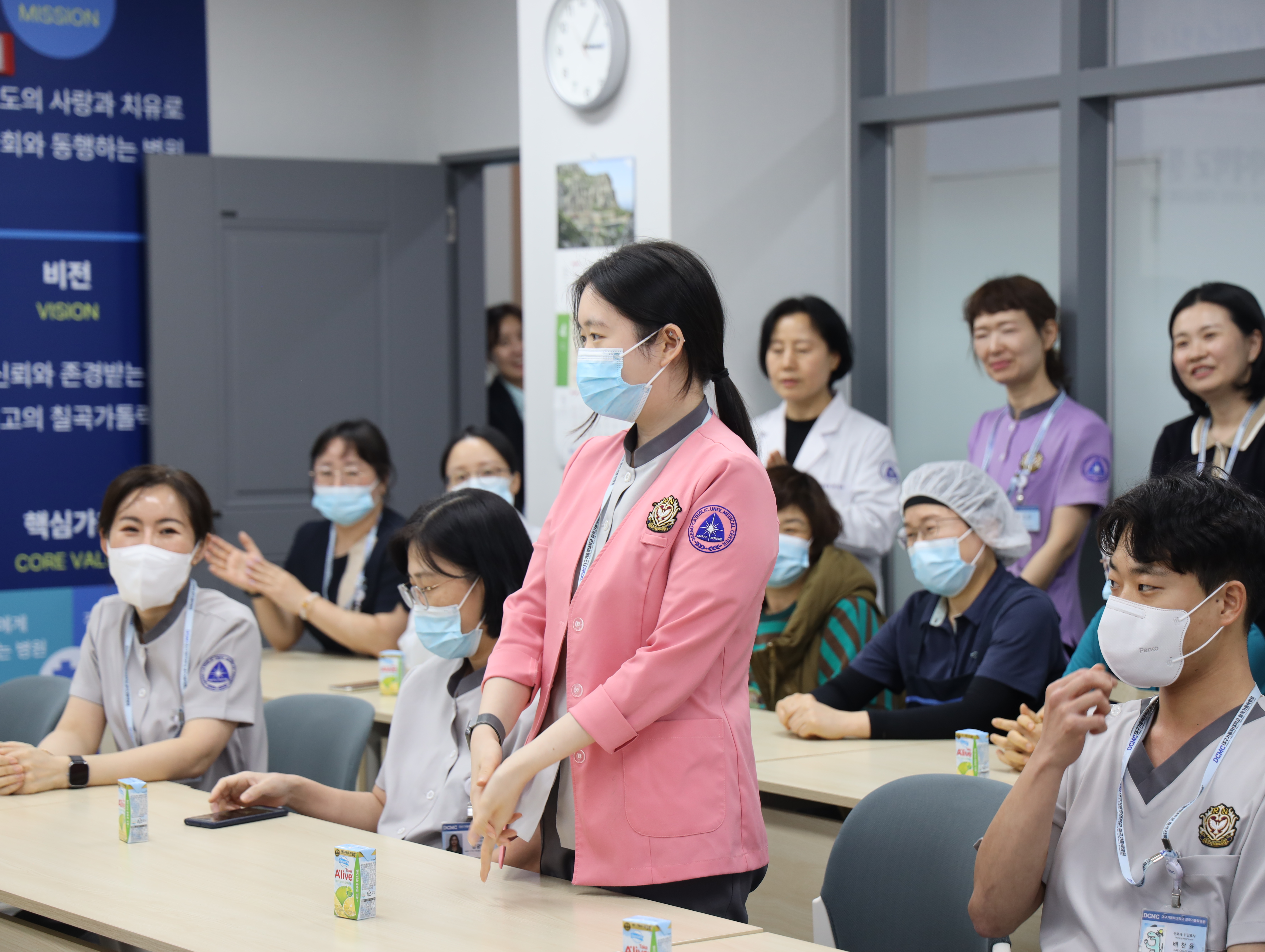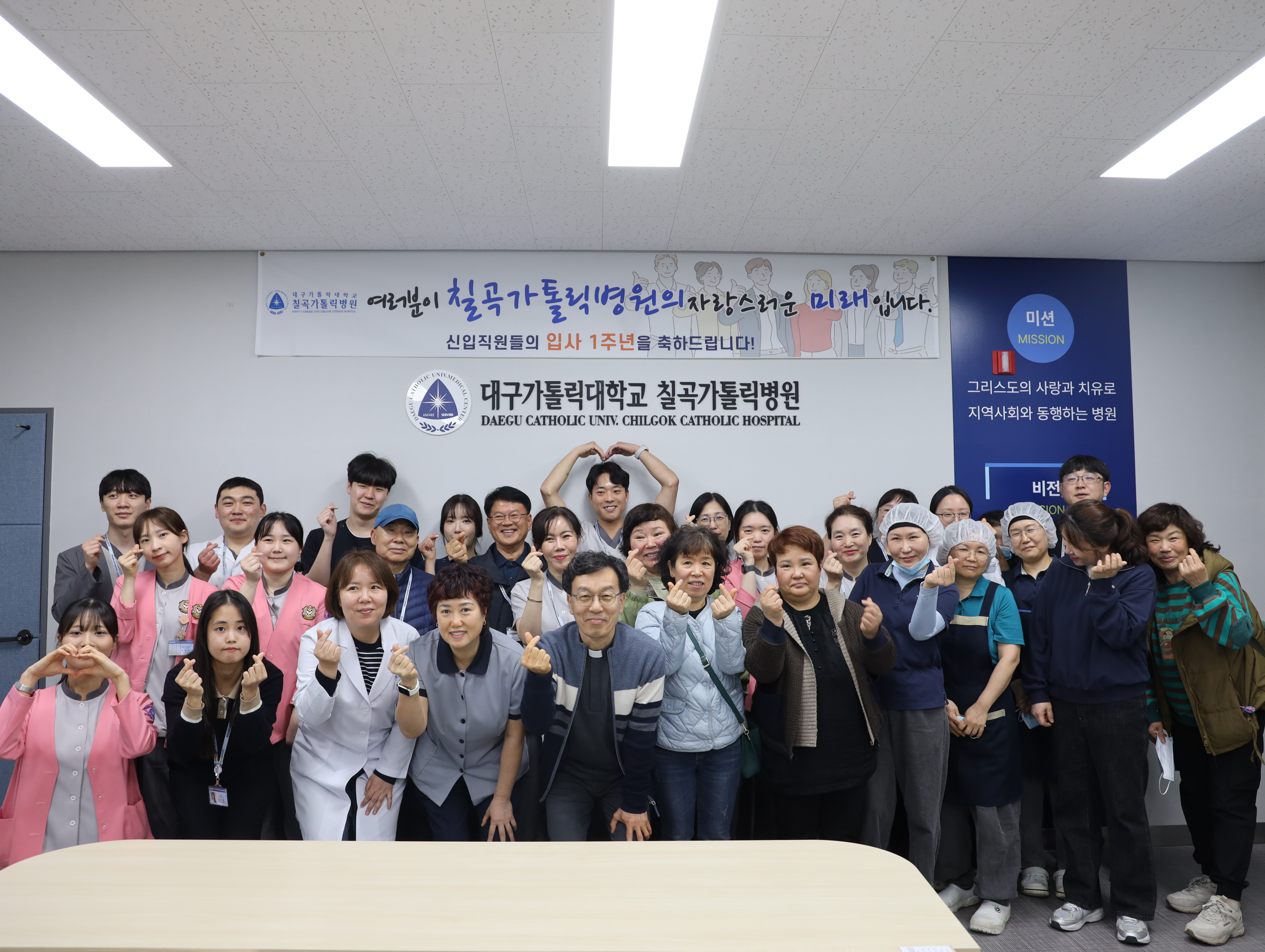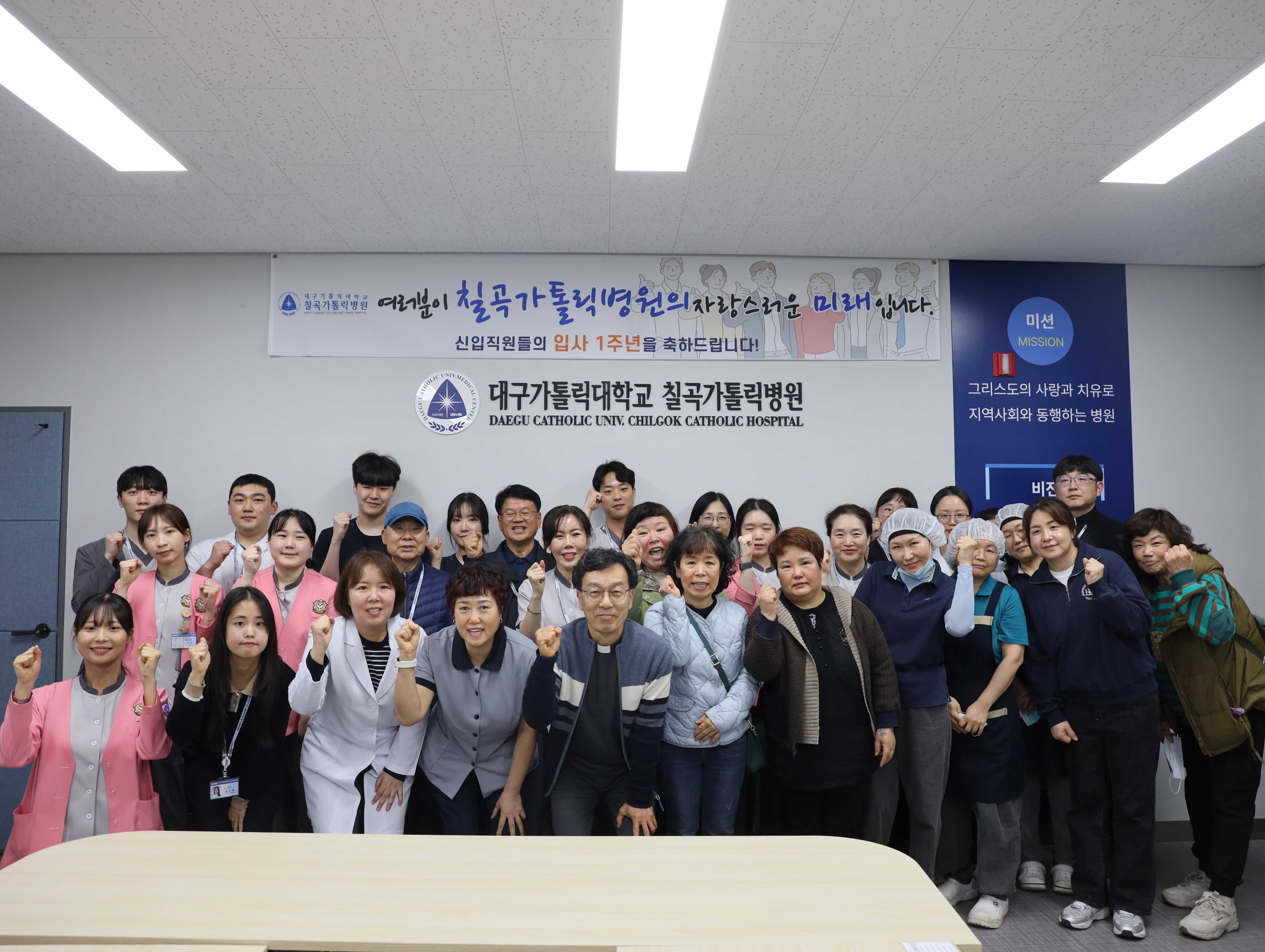 Change with you! 환자중심의 칠곡가톨릭병원입니다. 지난 3월 31일 칠곡가톨릭병원 신규 직원 입사 1주년을 기념하여 돌잔치 행사를 시행하였습니다! 칠곡가톨릭병원은 매년 미래를 함께할 주인공들을 위해 그동안의 노고를 격려하고, 축하 드리기 위해 돌잔치를 시행하고 있습니다. 이번 돌잔치는 2025년에 입사하신 직원분들을 대상으로 시행하였으며, 1년 동안 칠곡가톨릭병원 안에서 일한 소감을 발표하며 한층 더 성장할 수 있는 시간을 가졌습니다! 또한 항상 칠곡가톨릭병원을 위해 아끼지 않고 일을 하는 손을 보호하기 위해 풀리오 손마사지기를 돌잔치 선물로 전달하며 성장하는 칠곡가톨릭병원과 함께할 것을 다짐하는 뜻 깊은 시간이었습니다. 칠곡가톨릭병원은 고객님들께 양질의 의료 서비스를 제공하기 위해 전문 의료진 초빙, 첨단 장비 도입 뿐만 아니라 내부 직원의 근로 조건 및 근무 요건 개선을 통하여 직원 복지 향상에 최선을 다하고 있습니다. 직원이 서로 존중 받고, 찾아주시는 모든 분들께 최상의 서비스로 베풀 수 있는 지역 최고 칠곡가톨릭병원이 되도록 하겠습니다! 신규 입사자 분들의 입사 1주년을 다시 한번 축하 드립니다! |