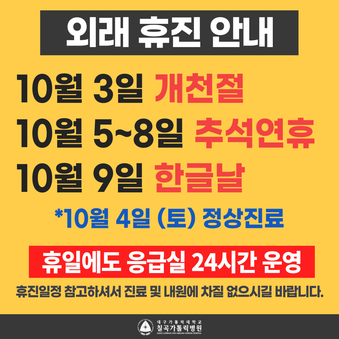 2025년 10월 3일~9일간 공휴일로 인한 휴진일정 안내 드립니다. (10월 4일 토요일은 정상진료) 10월 3일 개천절 10월 6일 ~ 8일 추석연휴 10월 9일 한글날로 인해 외래진료는 휴진이오니 특히 약을 정기적으로 복용하셔야 하는 분들은 휴진일정 참고하셔서 미리 넉넉하게 처방 받으시고 휴진 기간동안 불편함을 겪지 않도록 확인 부탁 드립니다. 연휴를 포함한 모든 공휴일에도 칠곡가톨릭병원 응급실은 365일 24시간 내내 전문의가 상주하여 진료하고 있으므로 갑작스러운 응급상황 발생시 당황하지 마시고 칠곡가톨릭병원 응급실을 방문하여 주시기 바랍니다. |
