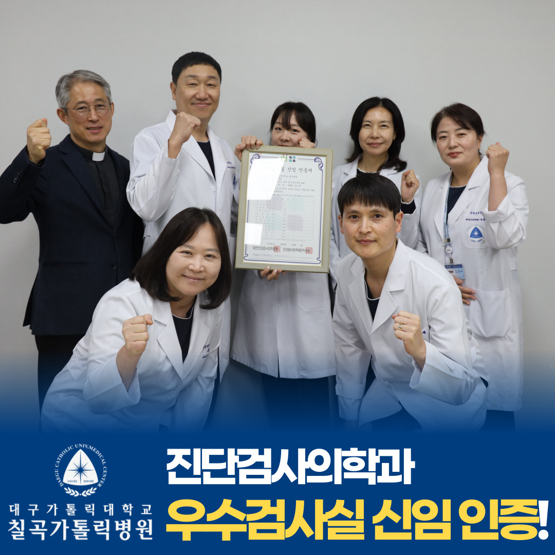 We change, 공감과 소통하는 칠곡가톨릭병원입니다! 칠곡가톨릭병원 진단검사의학과는 대한진단검사의학회와 진단검사의학재단이 주관하는 '우수검사실 신임 인증'평가에서 우수한 성적으로 인증을 획득하였습니다! 우수검사실 신임 인증 제도는 진단검사의학과의 검사 정확도와 운영체계를 종합적으로 평가하여 환자에게 신뢰도 높은 결과를 제공하기 위해 시행되는 제도로 ▲검사실 운영 ▲진단혈액 ▲임상화학 ▲임상미생물 ▲수혈 ▲진단면역 ▲종합검증 ▲현장검사 등 총 8개의 분야에서 우수한 성적을 거두었습니다. 특히 정확한 진단검사는 치료의 출발점이자 진료수준을 가늠하는 중요한 기준이 됩니다. 칠곡가톨릭병원은 이번 인증을 통해 신뢰할 수 있는 진단검사 결과와 첨단 의료장비를 갖춘 의료기관으로 인정받았습니다. 앞으로도 안전하고 정확한 검사를 받을 수 있게 최선을 다하겠습니다 :) |