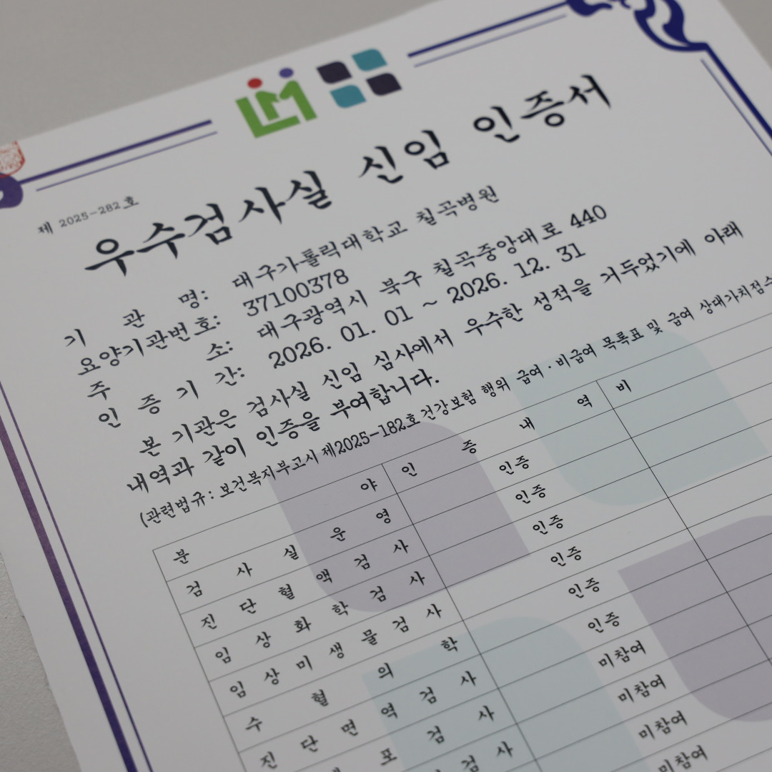 | [병원소식] 칠곡가톨릭병원 진단검사의학과 우수검사실 신임 인증 획득 | ||