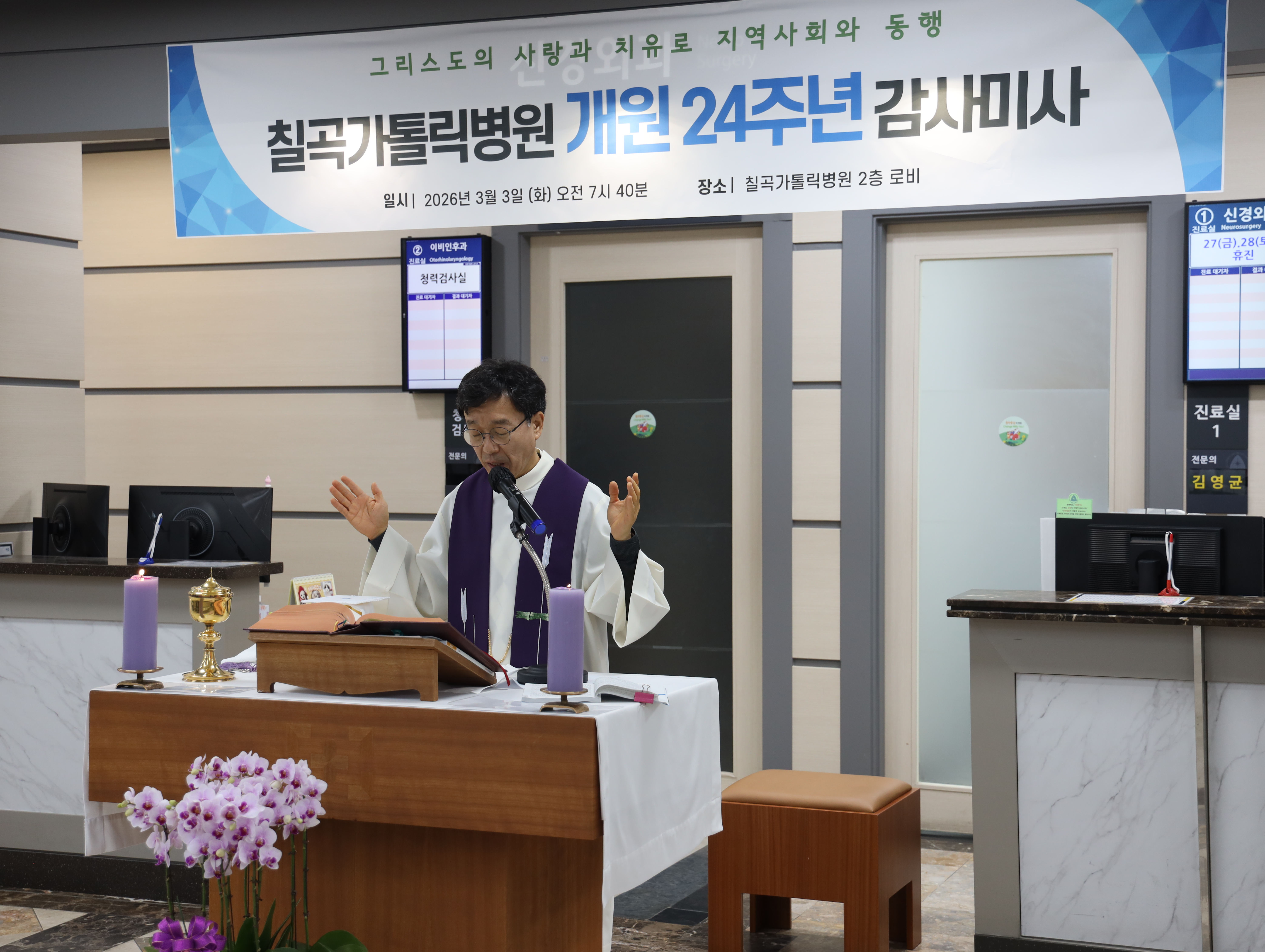 Change with you, 환자중심의 칠곡가톨릭병원입니다. 3월 3일 화요일 오전, 칠곡가톨릭병원 개원 24주년을 기념하기 위해 많은 직원들이 모인 가운데 개원 감사 미사를 봉헌하였습니다! 개원 24주년을 함께 축하하고, 격려하기 위해 이른 아침부터 직원분들이 참례를 하여 따뜻한 시간이 되었습니다. 2002년 개원 이후 지역친화, 환자중심이라는 이념 아래 지난 24년간 지역 주민들을 위해 최상의 의료 서비스를 위해 최선을 다할 수 있도록 격려의 말씀을 하셨습니다. 또한 칠곡가톨릭병원을 위해 10년, 20년이라는 오랜 시간을 함께 해주신 장기 근속 근무자에 대한 시상도 함께 있었습니다. 이른 시간에도 칠곡가톨릭병원 개원 24주년을 함께 축하해주신 직원 분들과 지난 24년간 칠곡가톨릭병원과 함께 해주신 모든 분들께 감사의 인사를 드립니다.