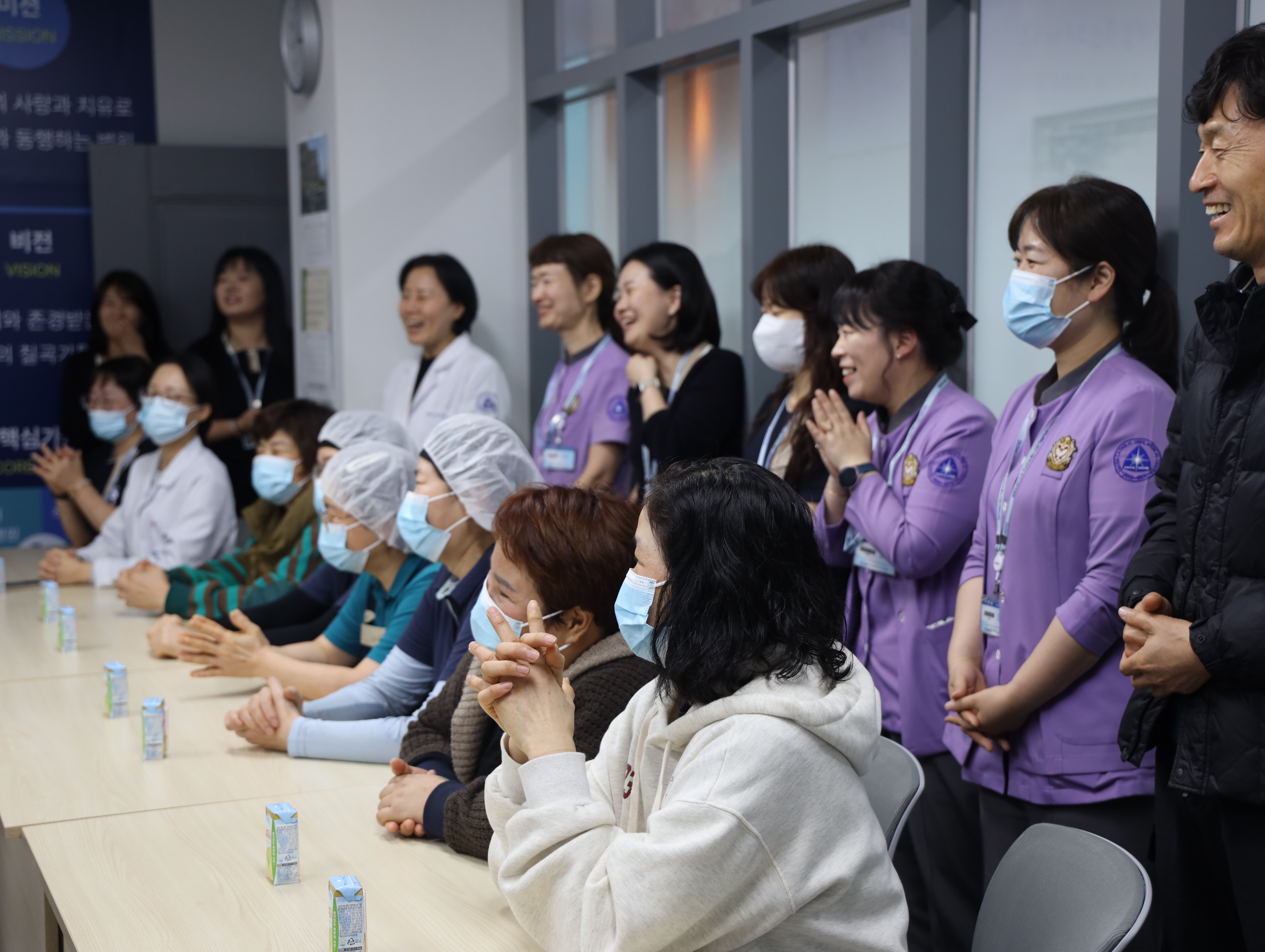 Change with you! 환자중심의 칠곡가톨릭병원입니다. 지난 3월 31일 칠곡가톨릭병원 신규 직원 입사 1주년을 기념하여 돌잔치 행사를 시행하였습니다! 칠곡가톨릭병원은 매년 미래를 함께할 주인공들을 위해 그동안의 노고를 격려하고, 축하 드리기 위해 돌잔치를 시행하고 있습니다. 이번 돌잔치는 2025년에 입사하신 직원분들을 대상으로 시행하였으며, 1년 동안 칠곡가톨릭병원 안에서 일한 소감을 발표하며 한층 더 성장할 수 있는 시간을 가졌습니다! 또한 항상 칠곡가톨릭병원을 위해 아끼지 않고 일을 하는 손을 보호하기 위해 풀리오 손마사지기를 돌잔치 선물로 전달하며 성장하는 칠곡가톨릭병원과 함께할 것을 다짐하는 뜻 깊은 시간이었습니다. 칠곡가톨릭병원은 고객님들께 양질의 의료 서비스를 제공하기 위해 전문 의료진 초빙, 첨단 장비 도입 뿐만 아니라 내부 직원의 근로 조건 및 근무 요건 개선을 통하여 직원 복지 향상에 최선을 다하고 있습니다. 직원이 서로 존중 받고, 찾아주시는 모든 분들께 최상의 서비스로 베풀 수 있는 지역 최고 칠곡가톨릭병원이 되도록 하겠습니다! 신규 입사자 분들의 입사 1주년을 다시 한번 축하 드립니다! |