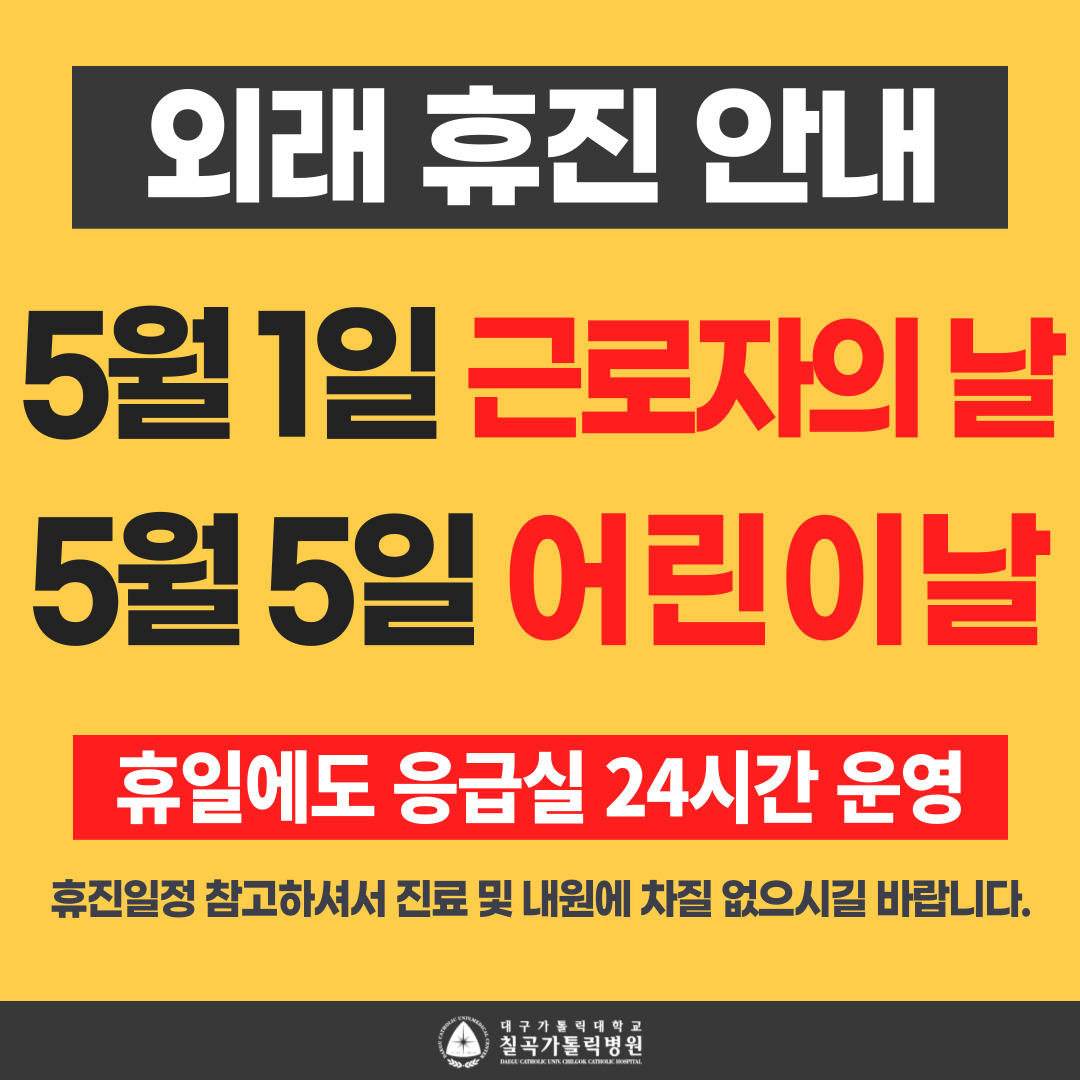 5월 1일 금요일 근로자의 날, 5일 화요일은 어린이날로 인한 외래 진료 휴진입니다. 특히 약을 정기적으로 복용하셔야 하는 분들은 휴진일정 미리 확인하셔서 넉넉하게 처방 받으시고, 휴진기간동안 불편함을 겪지 않도록 확인 부탁 드립니다. 칠곡가톨릭병원 응급실은 모든 공휴일에도 365일 24시간 전문의가 상주하여 진료하고 있으므로 갑작스러운 응급상황 발생시 당황하지 마시고 칠곡가톨릭병원 응급실을 방문하여 주시기 바랍니다. |