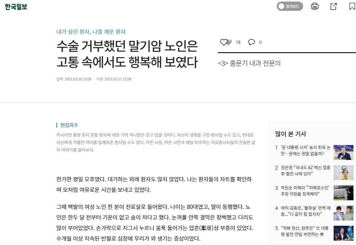 한국일보에서 잊지 못할 환자에 대한 기억을 담아보고자 기획한 "내가 살린 환자, 나를 깨운 환자" 시리즈의 세 번째 편으로 우리 칠곡가톨릭병원 홍문기 내과장님의 글이 기재되었습니다. "수술 거부했던 말기암 노인은 고통 속에서도 행복해 보였다." 라는 제목의 칼럼이었는데요, 환자분의 선택을 존중하면서 그에 대한 진심어린 마음이 담긴 홍문기 과장님의 글을 링크해 드리오니 많은 분들이 함께 글을 읽고 공유하였으면 좋겠습니다.