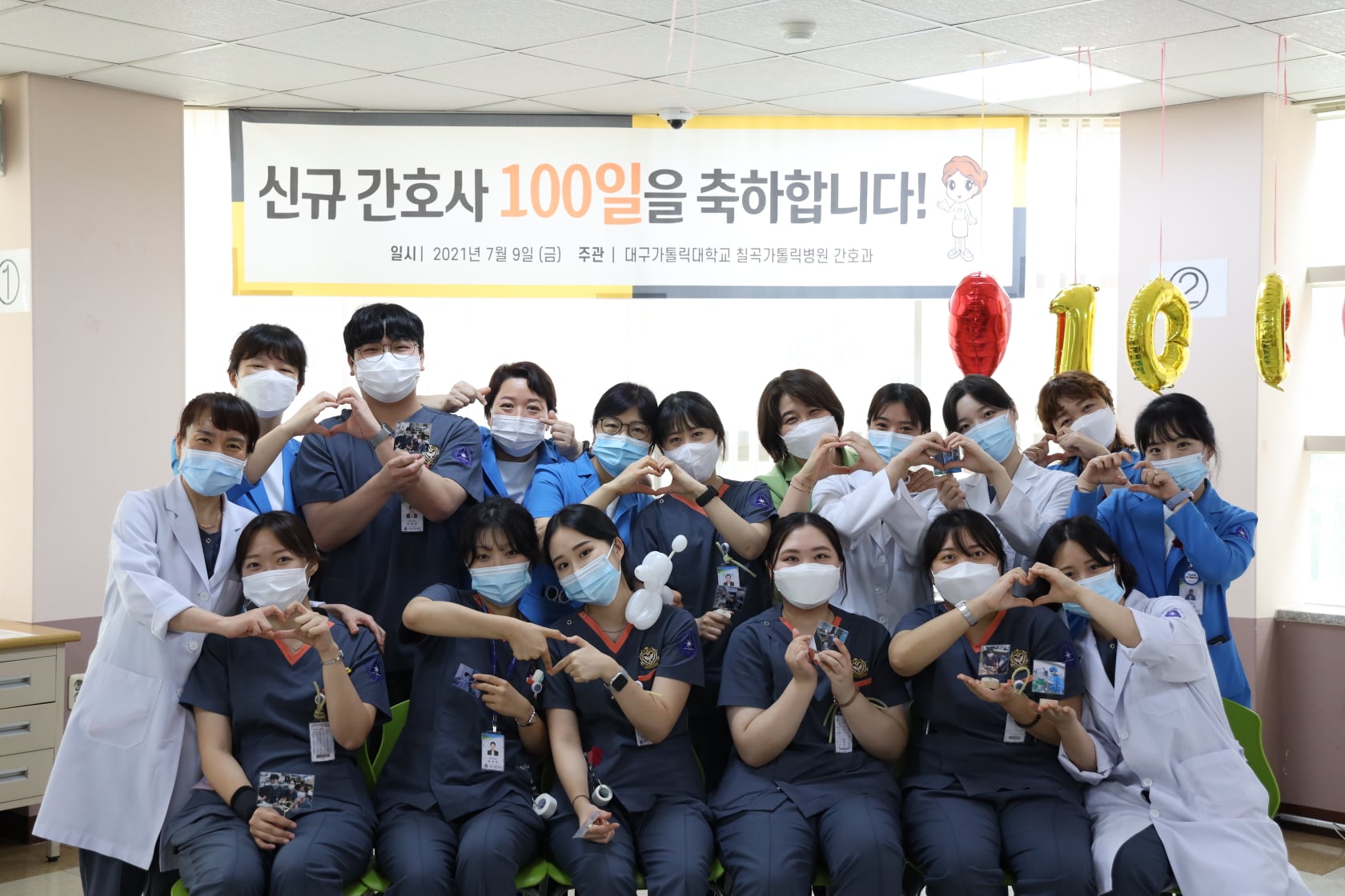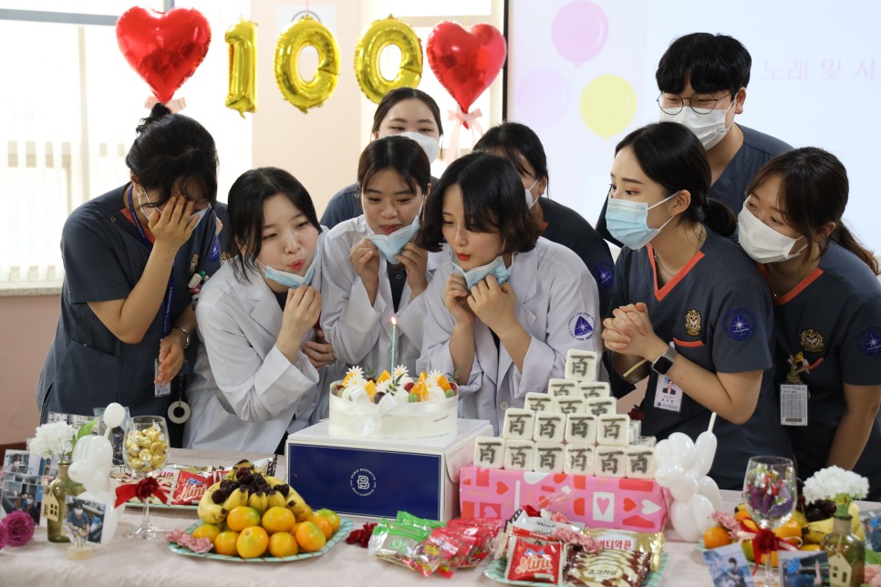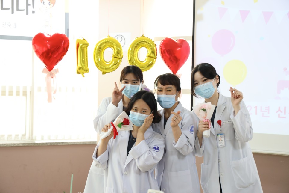 지난 7월 9일 칠곡가톨릭병원에서는 신규간호사를 대상으로 100일 기념파티가 있었습니다. 모두가 바쁜 업무에도 불구하고 신규간호사 선생님들의 100일을 기념하기 위해 모두 한걸음에 달려와 주셨습니다. 오늘의 자리가 신규간호사 분들이 앞으로 간호사 생활을 하면서 힘든 시간이 다가왔을 때 오늘의 기억을 되짚어 보며 다시 한번 에너지를 얻을 수 있는 자리가 되었으면 좋겠습니다. 1년 동안 칠곡가톨릭병원과 함께 하며 많은 성장을 이뤄낸 신규간호사 선생님들과 격려와 응원의 말씀을 아끼지 않고 해주신 프리셉터 선생님과 수간호사 선생님들께 감사의 인사를 드리겠습니다.
