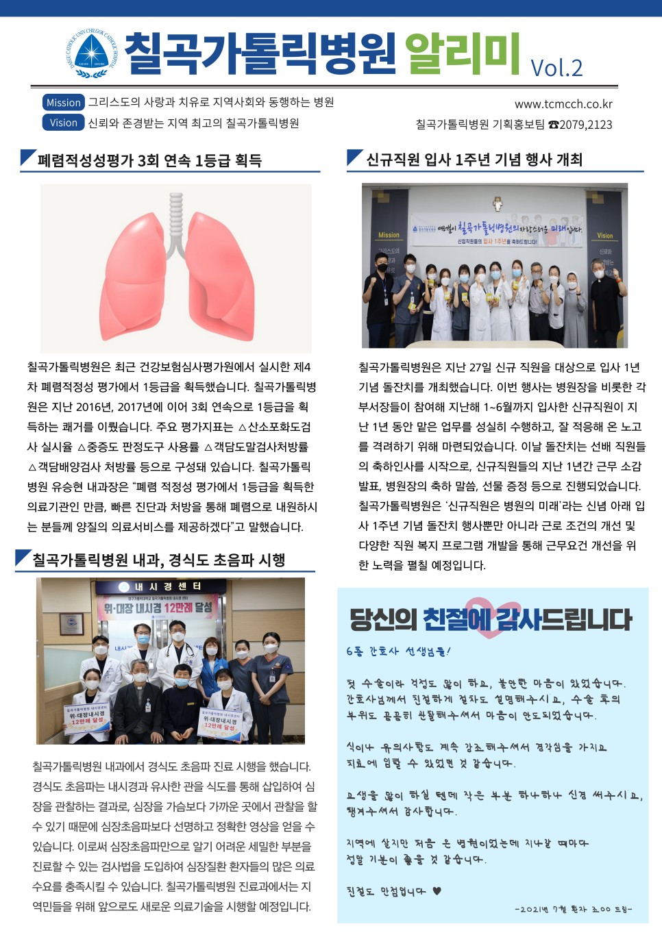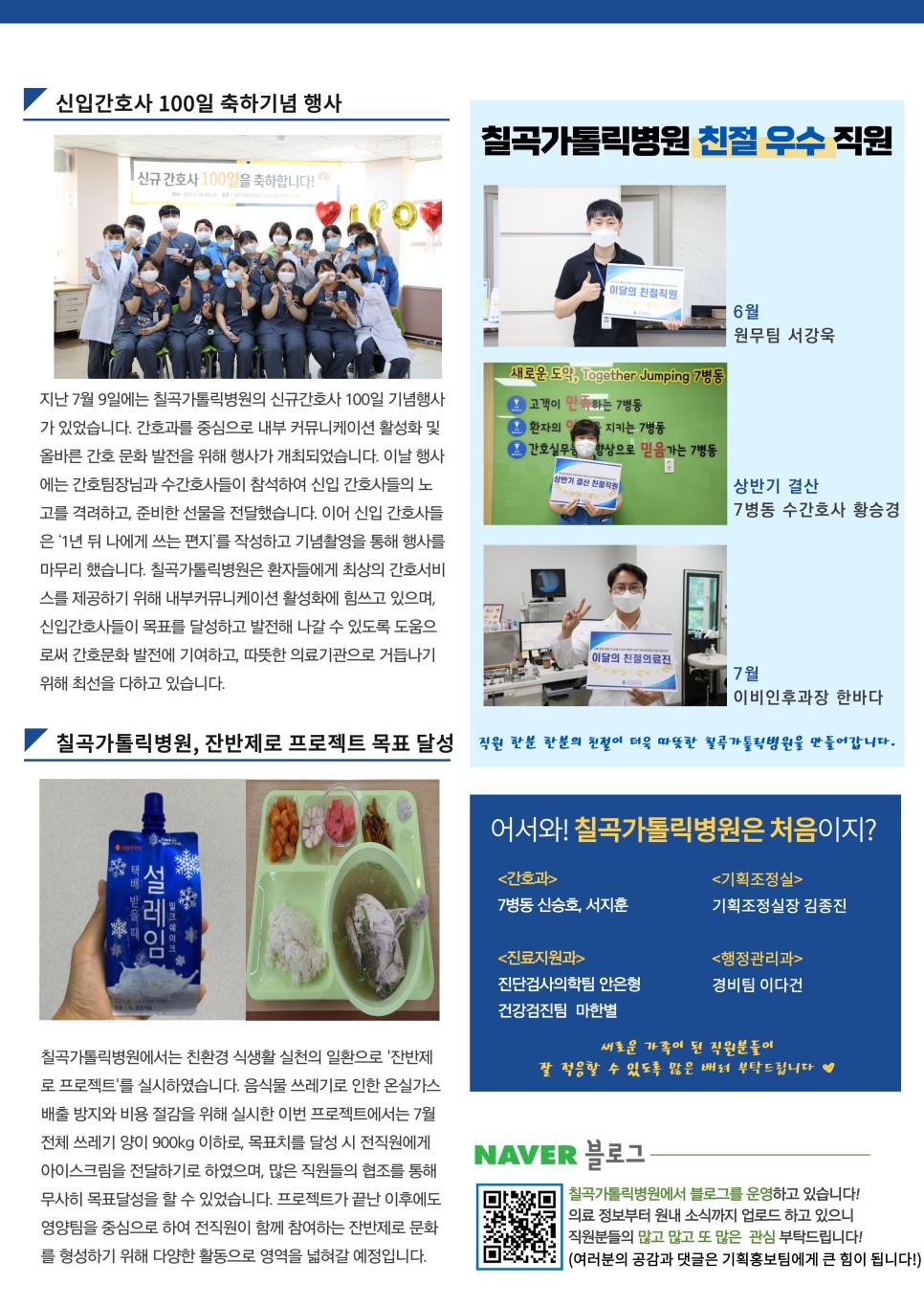 새로운 도약,Together jumping 2022! 칠곡가톨릭병원입니다. 다른 기업이나 병원을 방문하시면 많은 곳에서 내부 소식지를 발행하고 있는 곳을 많이들 보셨을 거예요. 칠곡가톨릭병원에서도 한 달에 한번 또는 두 달에 한번으로 소식지를 발행하고 있습니다! 아직은 소식지 발행 체계를 잡아가는 중이라 정식적으로 환자분들께 배부는 하지 못하지만, 일종의 베타테스트 기간동안은 직원들을 대상으로 소식지를 발행하고 있으며, 소식지를 바탕으로 내부 커뮤니케이션을 활성화하고 이슈를 공유하고 있습니다! 한 달동안 칠곡가톨릭병원에서 일어났었던 일들과, 의료관련 기사들, 친절 우수 직원 선정과 신규 입사자를 소개하는 채널을 생성하게 되면서 접점 부서가 아니라면 몰랐을 많은 이야기를 공유하고 있습니다! 각자 다른 파트에서 맡은 일을 충실히 수행하고 있기에 특히 신규 입사자 소개가 가장 유용한 정보라고들 하셨습니다 ~ 저희 직원분들만 공유하기엔 너무 아까운 자료라 발행될 때마다 고객분들께 직접 대면하여 배부 하지는 못해도 고객분들과 공유하고 싶은 마음에 블로그를 통해서 공유하고자 합니다! 사진을 클릭하면 확대하셔서 글씨까지 확인할 수 있으니 많은 관심을 가져주시고, 앞으로는 칠곡가톨릭병원과 함께 동행하는 고객 여러분들을 위해서 더욱 유용한 의료정보와 병원소식을 발행하여 재미와 많은 도움을 줄 수 있는 칠곡가톨릭병원이 되도록 하겠습니다.