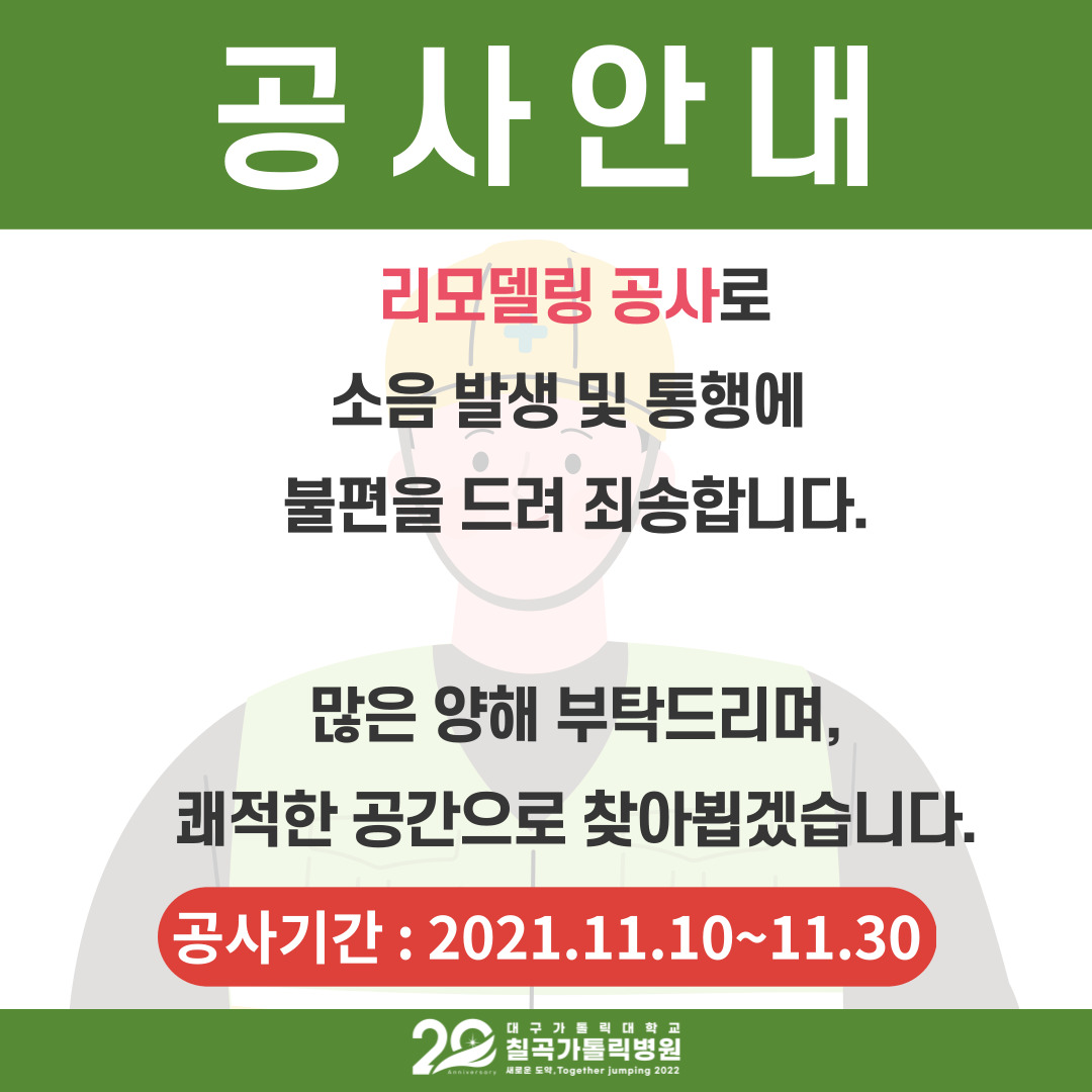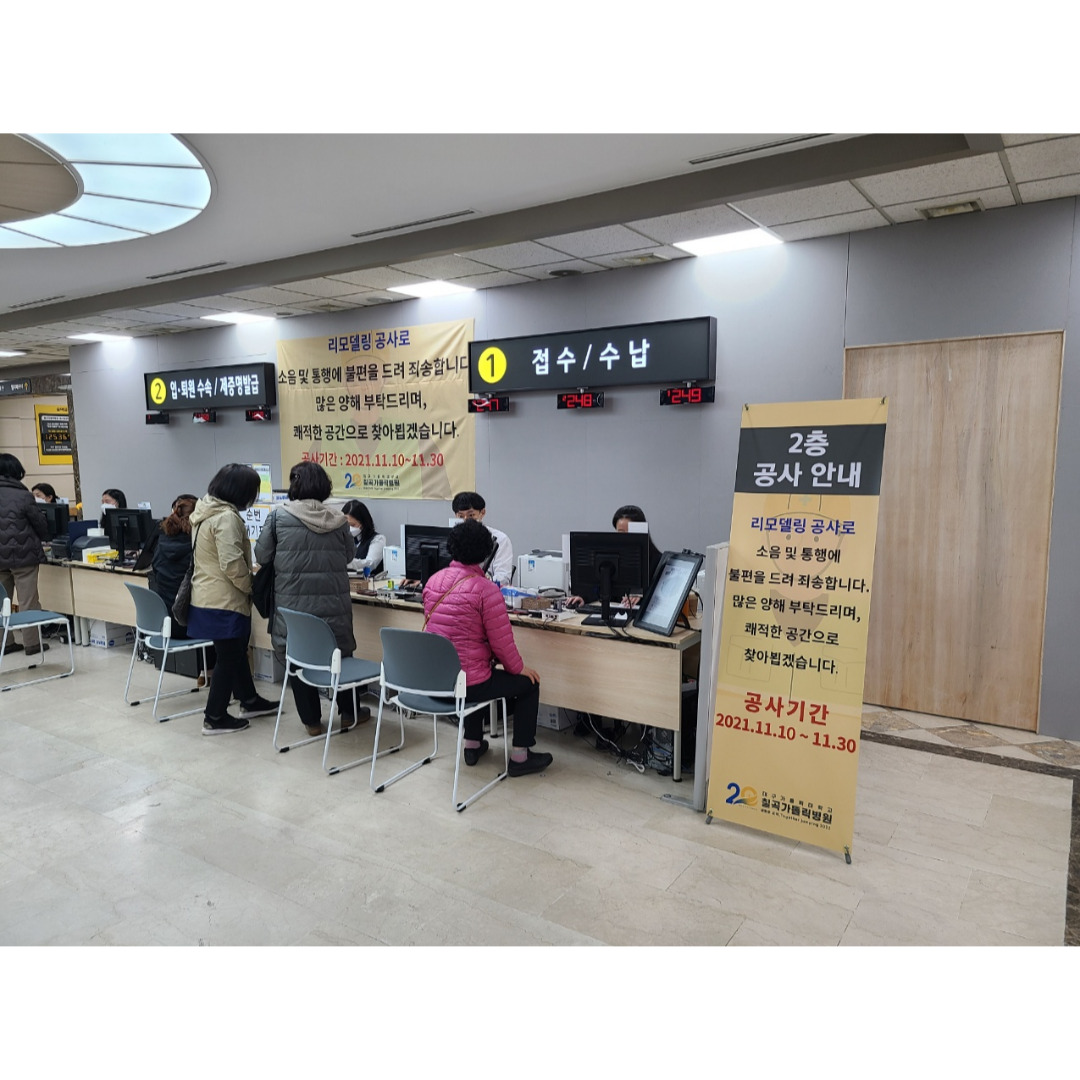 11월 10일부터 11월 30일까지 칠곡가톨릭병원 2층 리모델링 공사가 있을 예정입니다. 공사 기간 중에도 진료는 차질없이 진행될 예정이며, 공사 중 약간의 소음 발생 및 통행에 불편함이 있더라도 환우분들의 많은 양해 부탁드립니다.