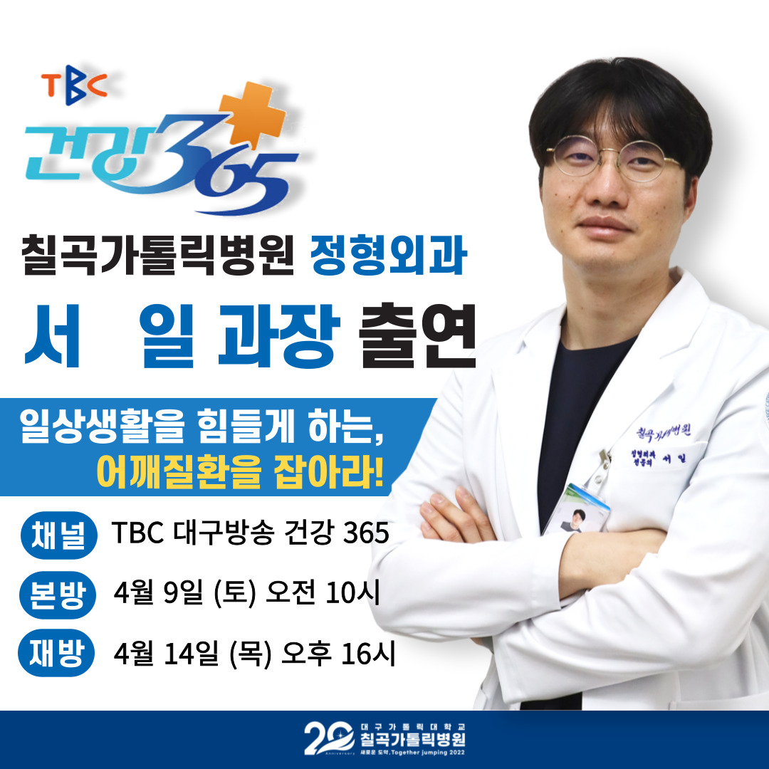 4월 9일 토요일에 방송되는 TBC 클리닉 건강 365에 서일 정형외과장님이 출연하십니다. 일상 생활을 힘들게 하는 주범인 어깨 질환에 대해 쉽게 알려드릴 예정입니다! 어깨 질환의 종류부터 치료법, 예방법까지 모두 알려드릴 예정이오니
