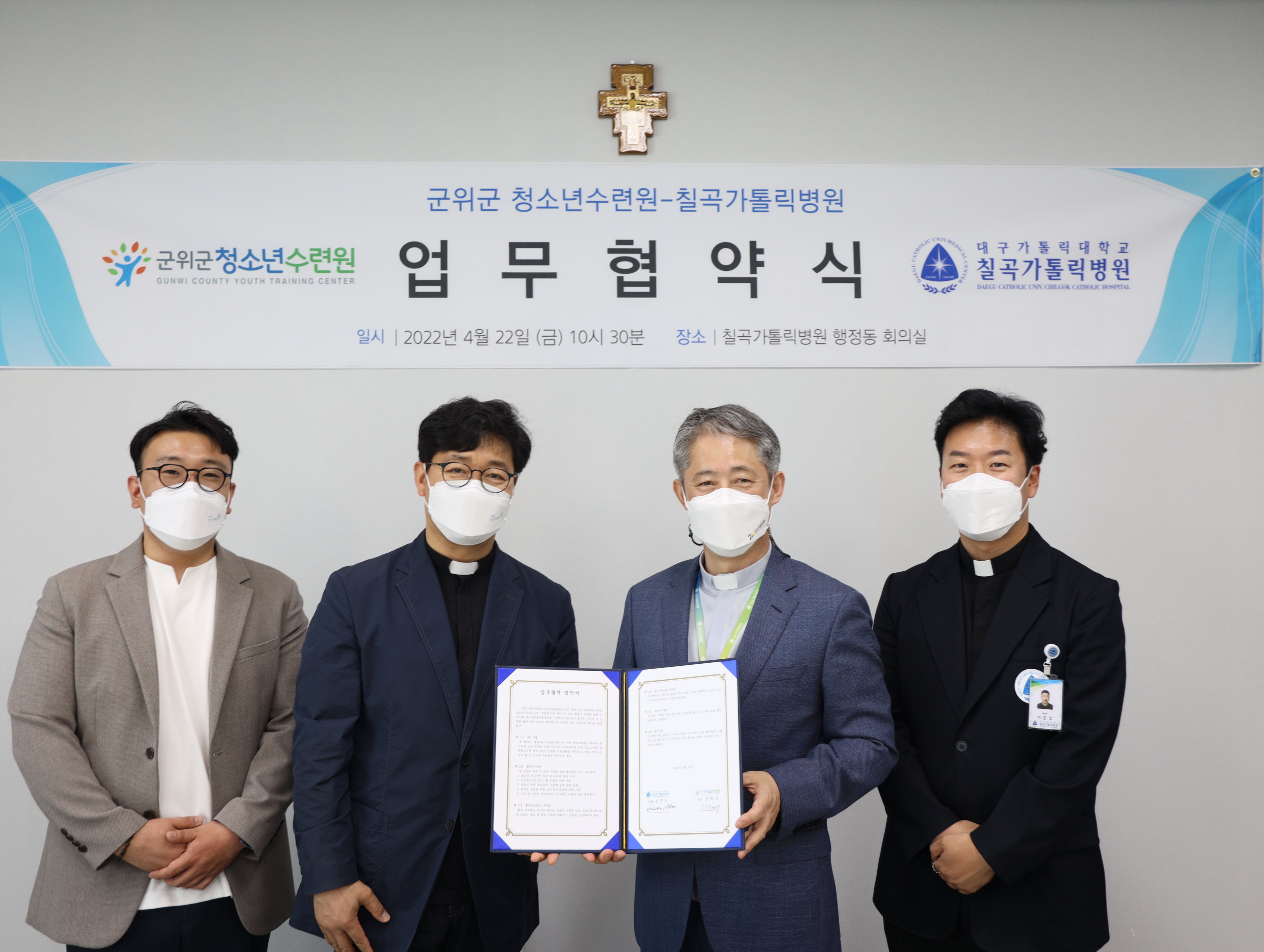 대구가톨릭대학교 칠곡가톨릭병원은 지난 4월 22일 군위군 청소년수련원과 지역사회 청소년 통합지원체계를 구축하고 청소년의 올바른 가치관 및 건강한 삶에 대한 비전 제시를 하기 위하여 업무협약(MOU)를 체결하였습니다.